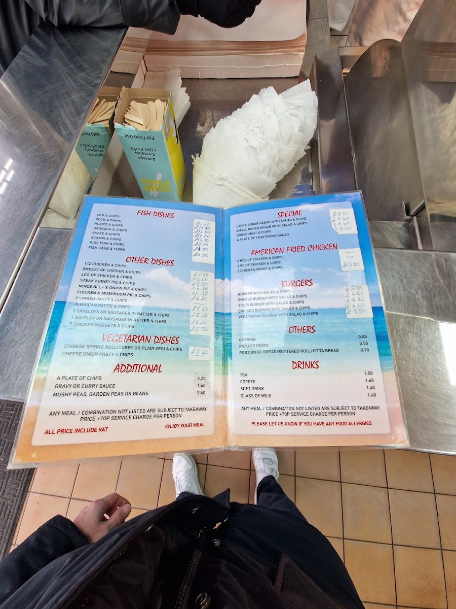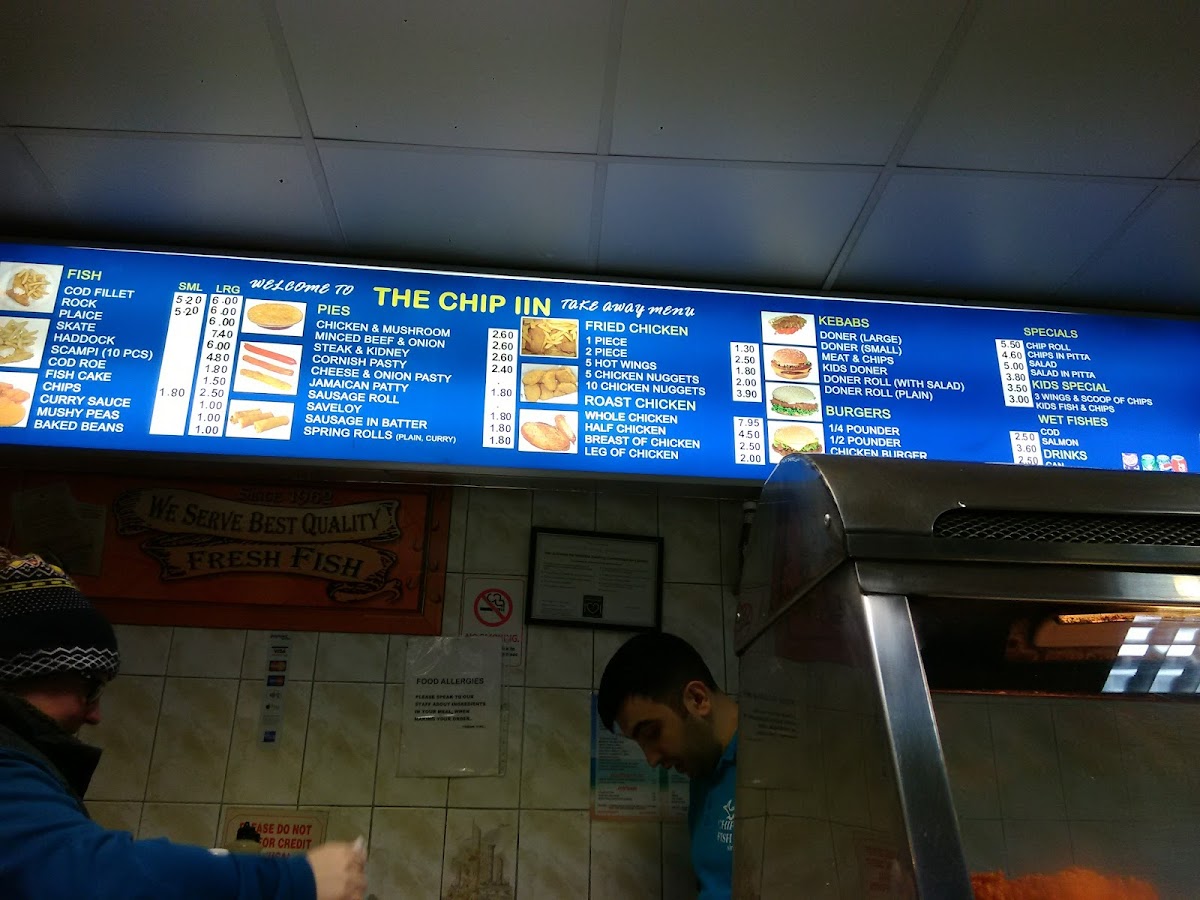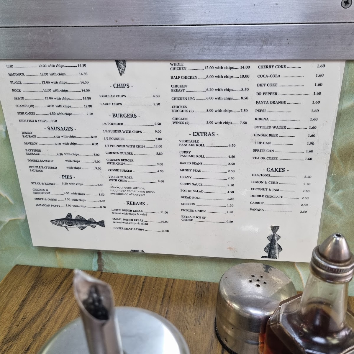 Overall, the menu at Chip Inn Fish Bar offers a classic and satisfying range of takeaway favorites, with a strong emphasis on traditional fish and chip combinations like Cod & Chips, Rock & Chips, Plaice & Chips, Haddock & Chips, and Skate & Chips, all forming the backbone of the selection. Beyond seafood, hearty options such as 1/2 Chicken & Chips, Breast Of Chicken & Chips, Leg Of Chicken & Chips, Steak Kidney Pie & Chips, and Mince Beef & Onion Pie & Chips provide comforting alternatives. Vegetarian choices, including Chinese Spring Roll (Curry Or Plain Veg) & Chips and Cheese Onion Pasty & Chips, ensure inclusivity, while extras like A Plate Of Chips, Gravy, and Mushy Peas round out the meal. The menu also diversifies with specials like Large Doner Kebab With Salad & Chips, Small Doner Kebab With Salad & Chips, and Doner Meat & Chips, alongside American-style options such as 2 Pcs Of Chicken & Chips, 1 Pc Of Chicken & Chips, and 5 Chicken Wings & Chips. Burger lovers can choose from Burger With Salad & Chips, Cheese Burger With Salad & Chips, 1/2lb Burger With Salad & Chips, Chicken Burger With Salad & Chips, and Vegetarian Burger With Salad & Chips. Finishing touches include simple desserts like Lemon & Curd, Coconut & Jam, Double Chocolate, Carrot, and Banana cakes, plus drinks such as Tea, Coffee, and Soft Drink, making the menu well-rounded, familiar, and satisfying for a wide range of tastes.